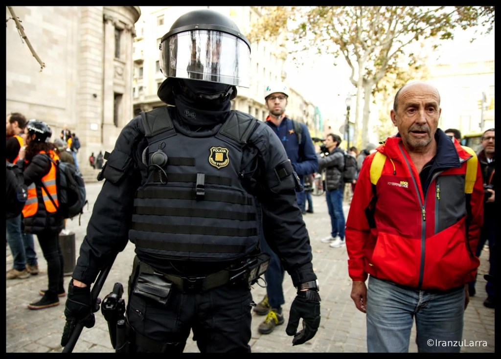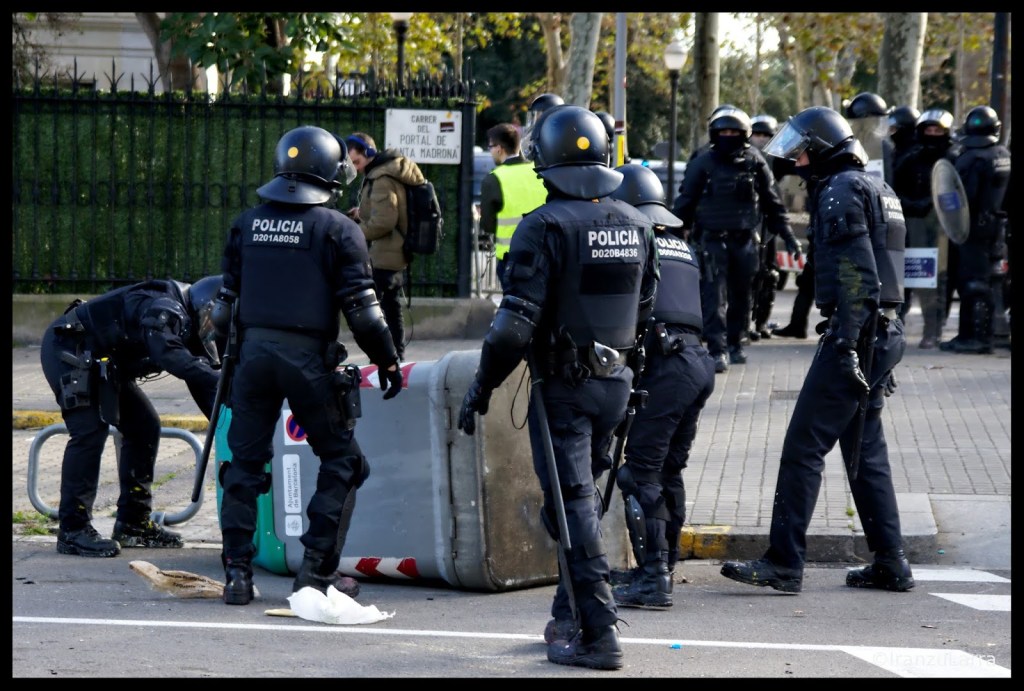 La mañana del 21D comenzó con los comercios cerrados y las principales arterias de la ciudad, como la Via Laietana, cortadas al tráfico. Los manifestantes, organizados en diferentes columnas, empezaron a avanzar entorno a las 8 horas hacia el lugar en el que se celebraba la reunión política. Con gritos de «¡Que se vayan!», un grupo concentrado en Laietana, recorrió unos metros hasta que un cordón policial de los Mossos d’ Esquadra les impidió el paso.