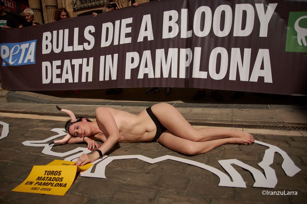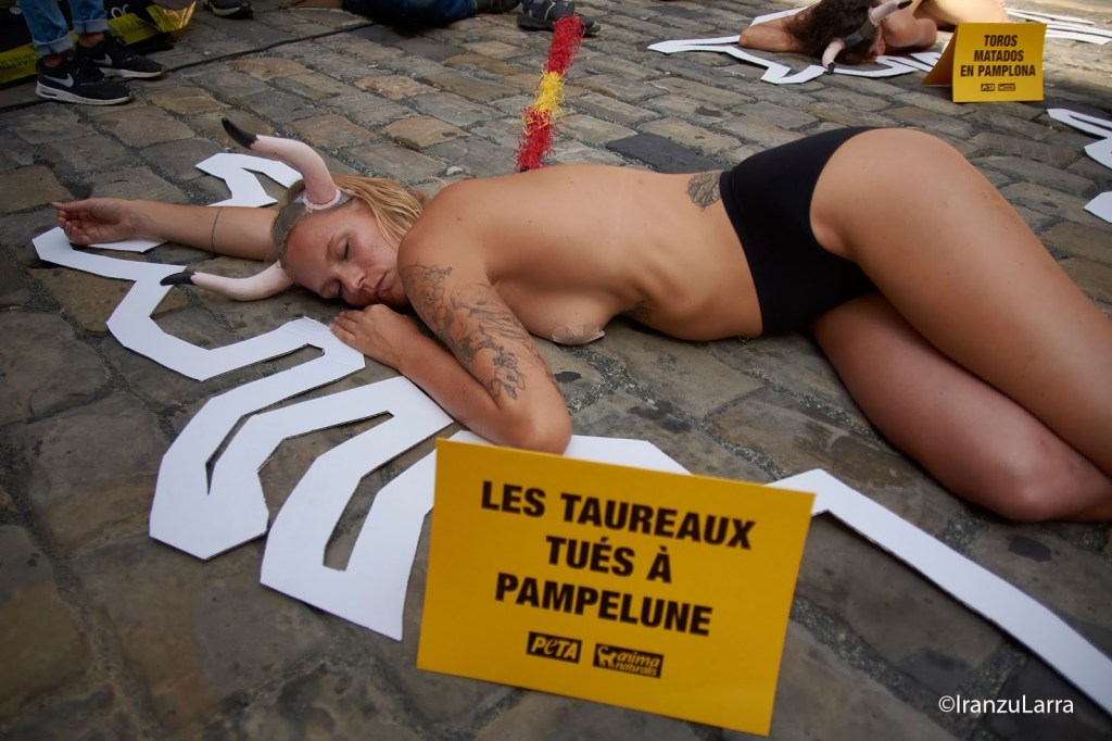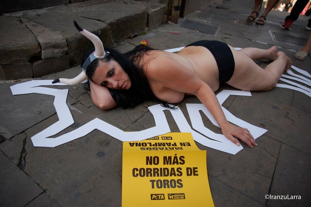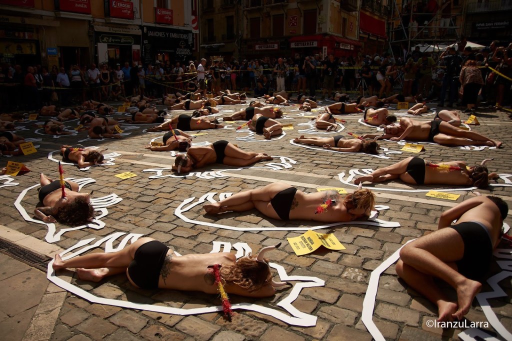 Como cada 5 de julio, desde hace 16 años, las organizaciones por la defensa de los animales AnimaNaturalis y PETA han protagonizado hoy una protesta contra la tauromaquia en Pamplona. Con gritos de «¡Tauromaquia abolición!» los activistas han pedido unos Sanfermines sin sangre y en los que las corridas de toros sean cosa del pasado. Para ello, han protagonizado una llamativa escenificación, que representaba la escena de un crimen. Los voluntarios, semidesnudos y con cuernos, se han metido en la piel de los 54 toros que serán lidiados, simbolizando los ‘cadáveres’ que dejarán las corridas de toros estos Sanfermines.