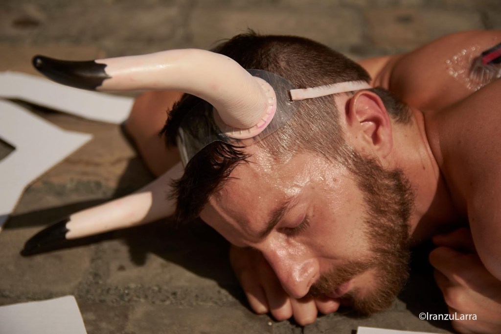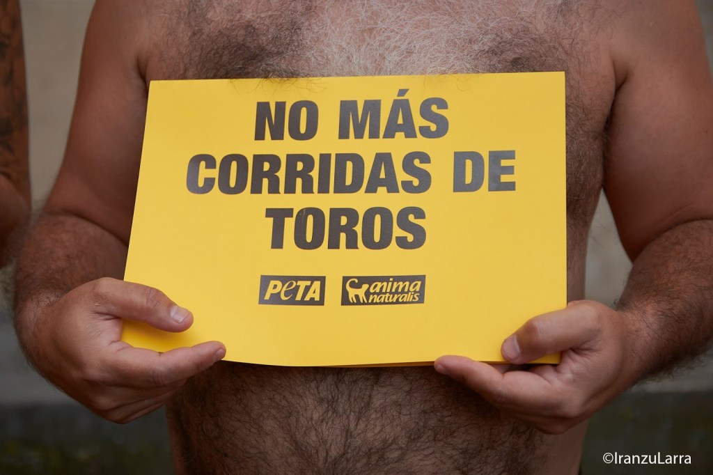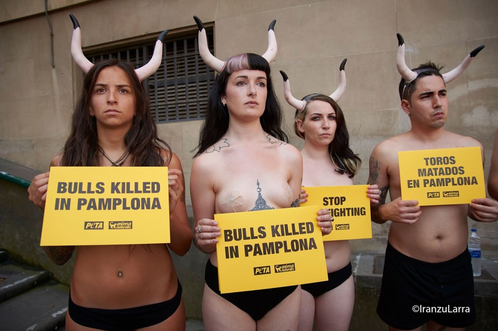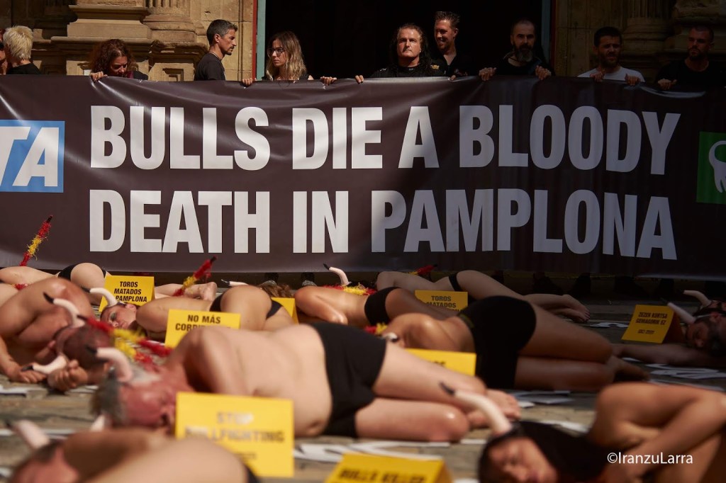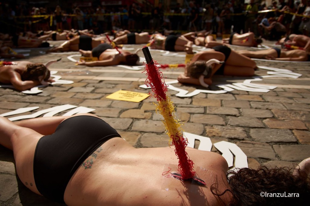 Como cada 5 de julio, desde hace 16 años, las organizaciones por la defensa de los animales AnimaNaturalis y PETA han protagonizado hoy una protesta contra la tauromaquia en Pamplona. Con gritos de «¡Tauromaquia abolición!» los activistas han pedido unos Sanfermines sin sangre y en los que las corridas de toros sean cosa del pasado. Para ello, han protagonizado una llamativa escenificación, que representaba la escena de un crimen. Los voluntarios, semidesnudos y con cuernos, se han metido en la piel de los 54 toros que serán lidiados, simbolizando los ‘cadáveres’ que dejarán las corridas de toros estos Sanfermines.